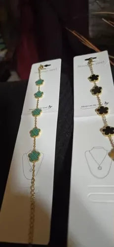 "OMG, no puedo superar lo hermosa que es esta pulsera. El diseño de cinco hojas es tan único y llamativo. Me encanta la longitud ajustable; se ajusta perfectamente a mi muñeca. Todos preguntan dónde la conseguí. Altamente recomiendo este accesorio chic. En serio, ¡consigue una!"
