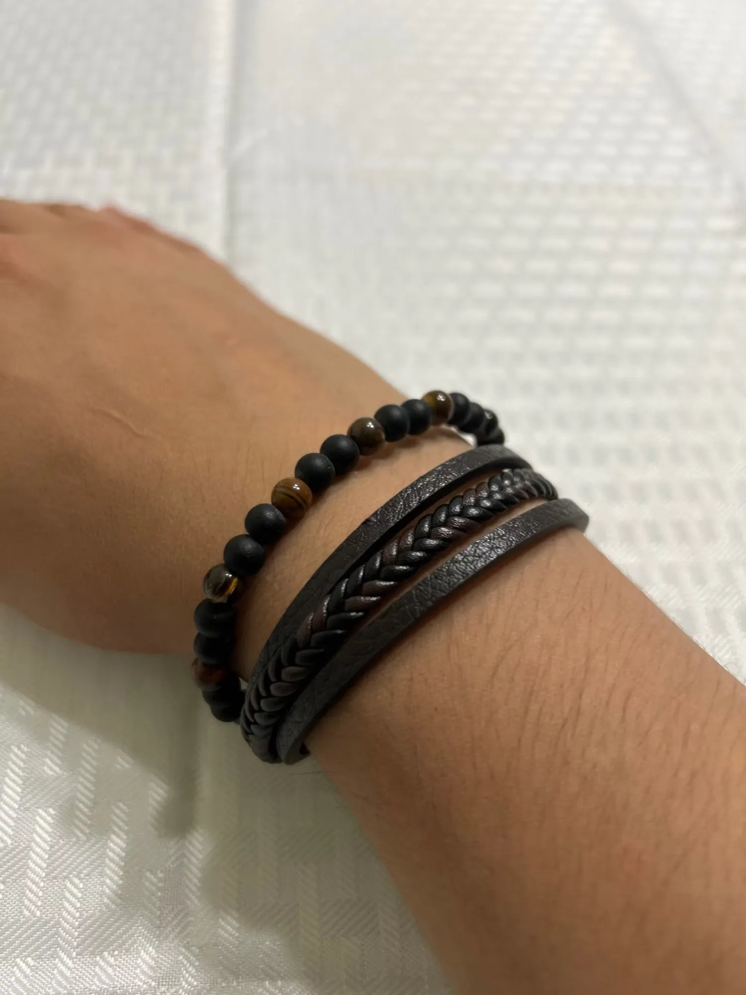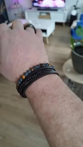 No estaba seguro de pedir joyas en línea, pero me alegra haberle dado una oportunidad a este. La combinación de cuero y cuentas de ojo de tigre funciona mejor de lo esperado. Se envuelve sin sentirse voluminoso y definitivamente destaca de una buena manera. Me han detenido un par de veces con el típico 'Oye, ¿dónde conseguiste ese brazalete?' No tengo arrepentimientos aquí.
